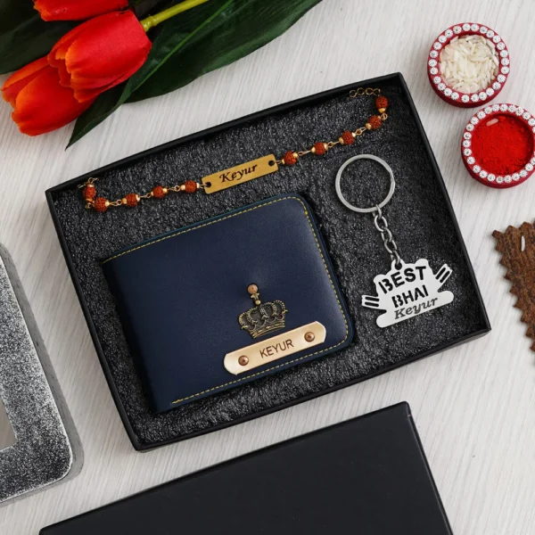 Package Content: 1 Personalized Rakhi, 1 Personalized Wallet, 1 Personalized Keychain