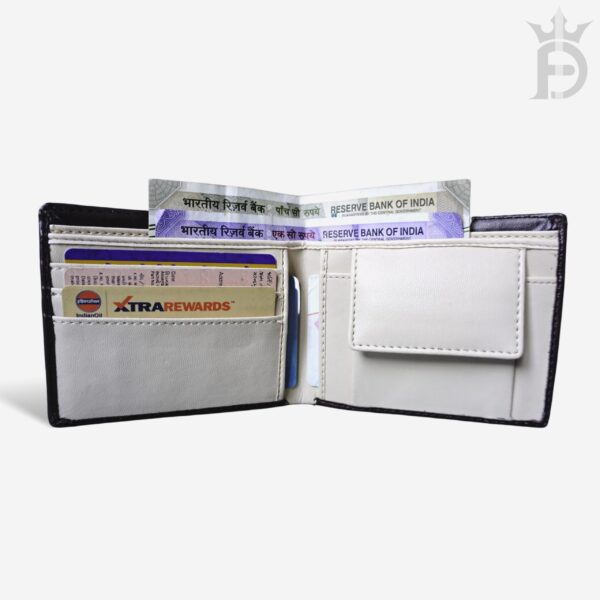 • Men’s wallet has 2 compartments for currency notes. It has slots for 3 cards and also has slot for ID card and a hidden slot.