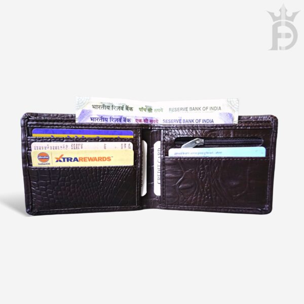 - Men’s wallet has 2 compartments for currency notes. It has slots for 3 cards and also has slot for ID card and a hidden slot.