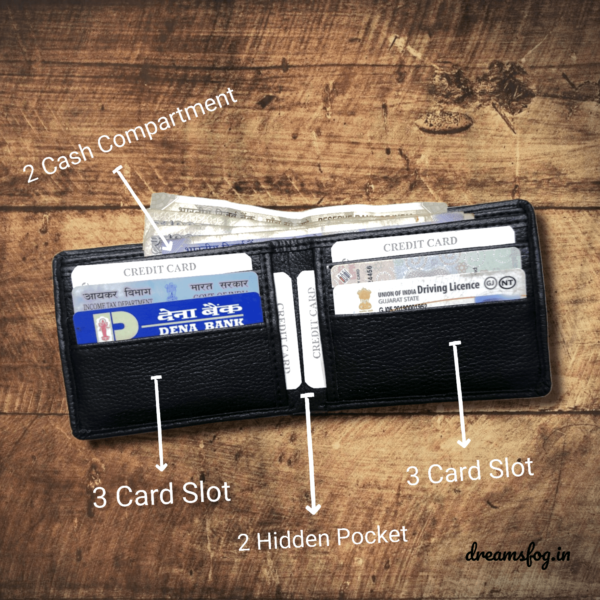• Men’s wallet has 2 compartments for currency notes. It has slots for 3 cards and also has slot for ID card and a hidden slot.